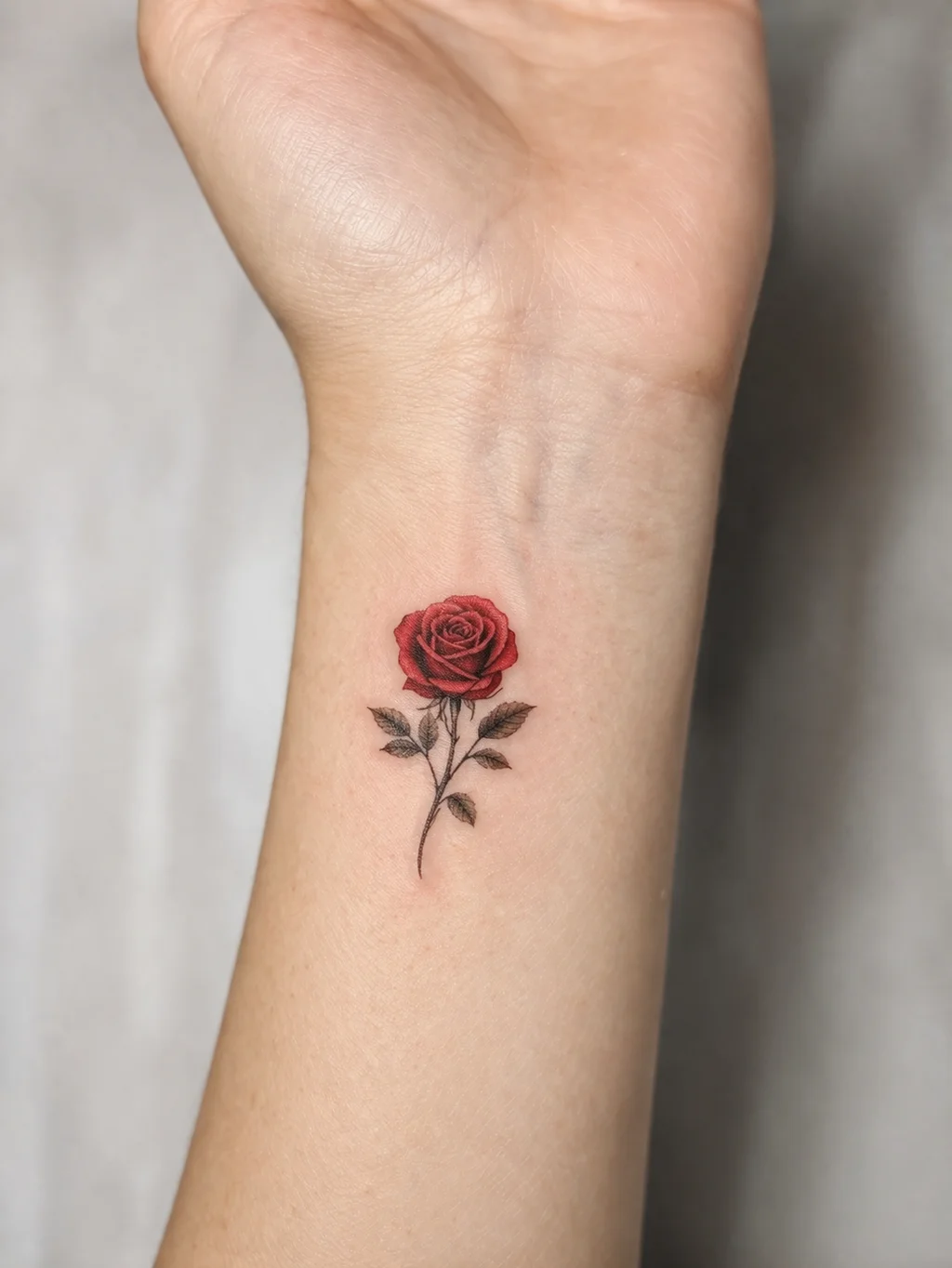 A beautifully detailed small rose tattoo on the inner wrist, rendered in a realistic style with soft red shading and delicate thin black outlines. The single bloom features natural petal layers and a few small green leaves, creating a classic yet feminine design. At just two inches, this rose tattoo is perfect for anyone wanting a subtle yet meaningful piece of body art.